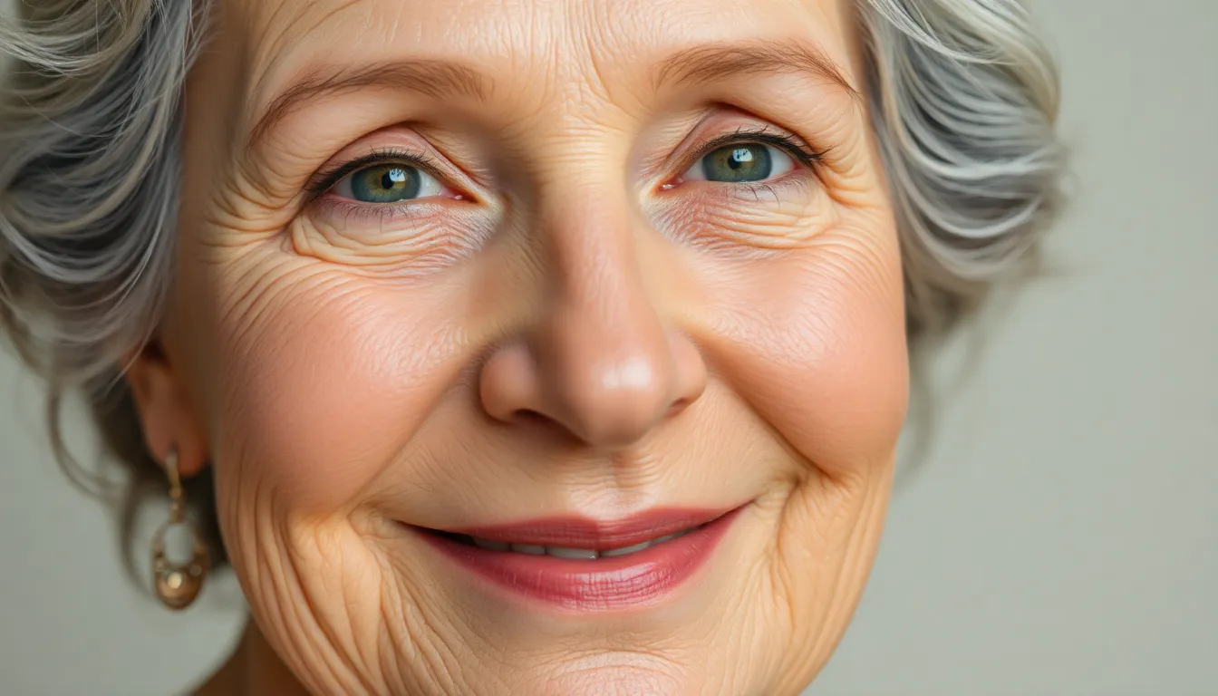 The eyes typically reveal signs of age, including fine lines around the eyelids. Dark circles may become prominent, adding to the expression of wisdom and life experience. Lips often lose volume, leading to a different facial symmetry compared to younger years.